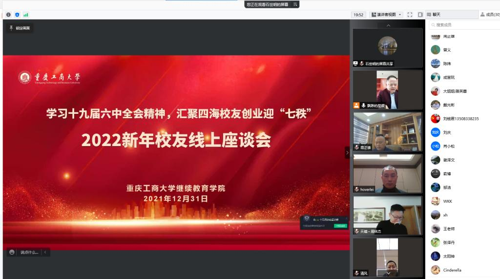为进一步向校友宣传党的十九届六中全会精神,共同庆祝元旦新年,以崭新的姿态迎接完美官网70周年校庆,继续教育学院于12月31日举行了主题为“学习十九届六中全会精神,汇聚四海校友创业迎七秩”2022新年校友线上座谈会。继续教育学院党总支书记石世明、院长杜朝辉、学院教职工和全国各地校友代表参加了本次座谈会,活动由继续教育学院校友分会秘书长陈之举主持。
