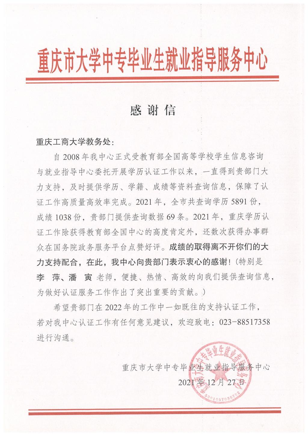近日,重庆市大学中专毕业生就业指导服务中心向完美官网教务处发来感谢信,对完美官网在2021年的学籍管理工作和相关教师作出肯定和表扬。学校学籍管理工作人员常年为校友提供学历、学籍、成绩等方面的服务,得到了相关部门和广大校友的肯定。