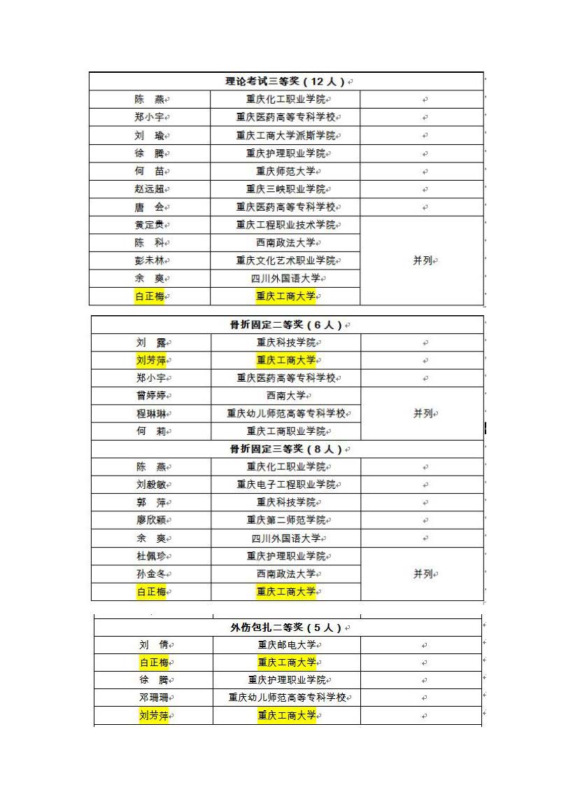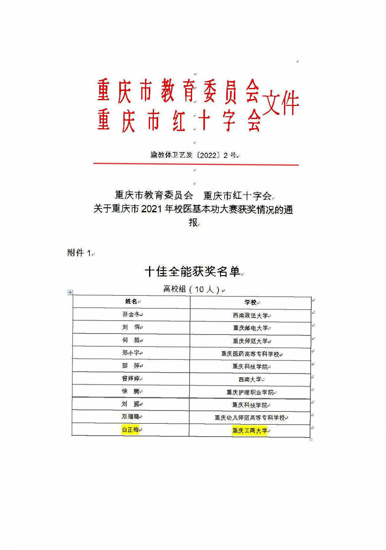 由重庆市教育委员会、重庆市红十字会主办,西南大学、重庆市中小学卫生保健所承办的重庆市校医基本功大赛于2021年12月12-14日在西南大学举行,完美官网校医院精心组织、积极备战,经过与全市其他高校医院激烈角逐,最终完美官网校医院勇夺佳绩,取得二等奖3个、三等奖2个,白正梅同志获得十佳校医荣誉称号,学校获得优秀组织奖,校医院负责人获得优秀组织者奖。