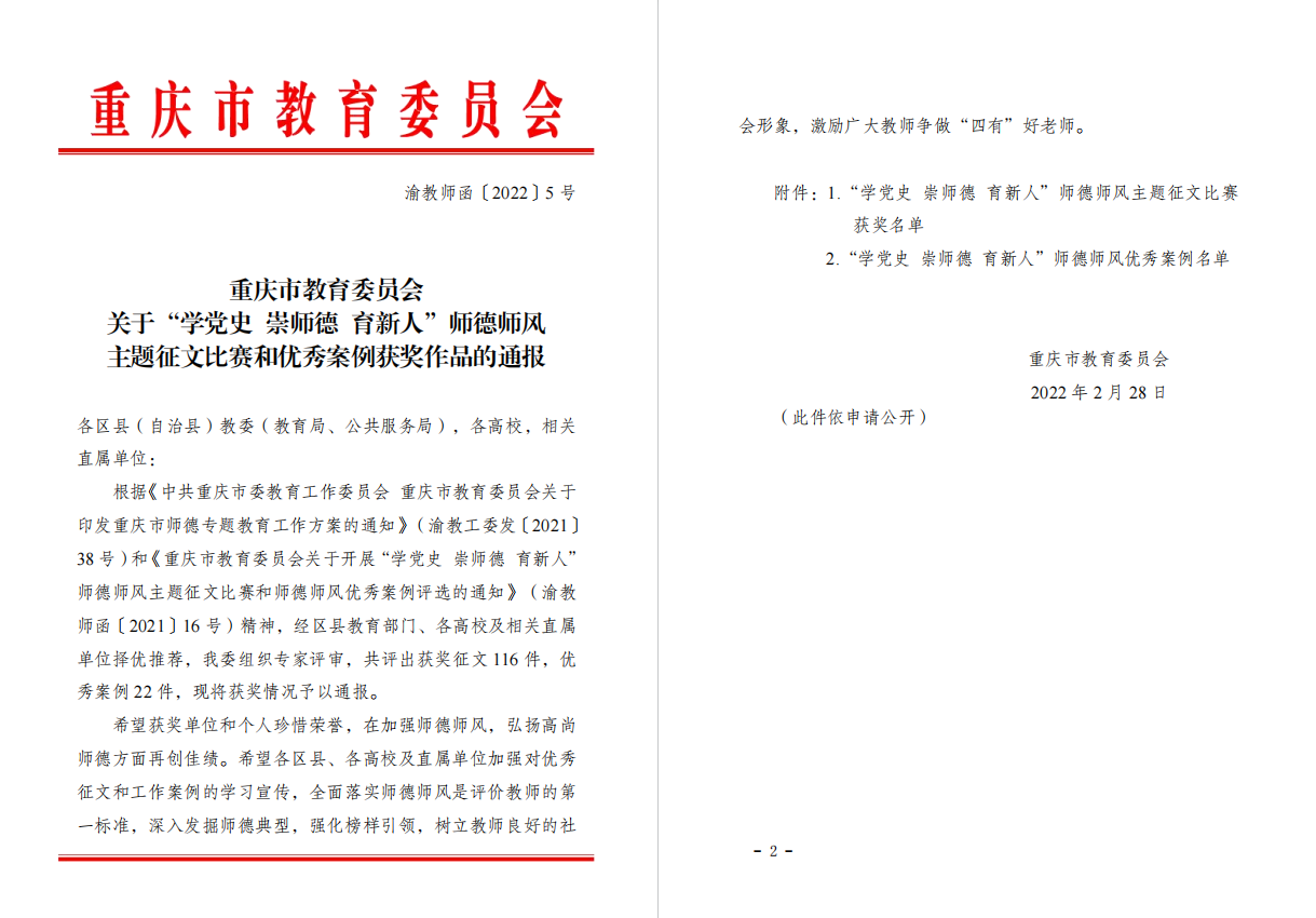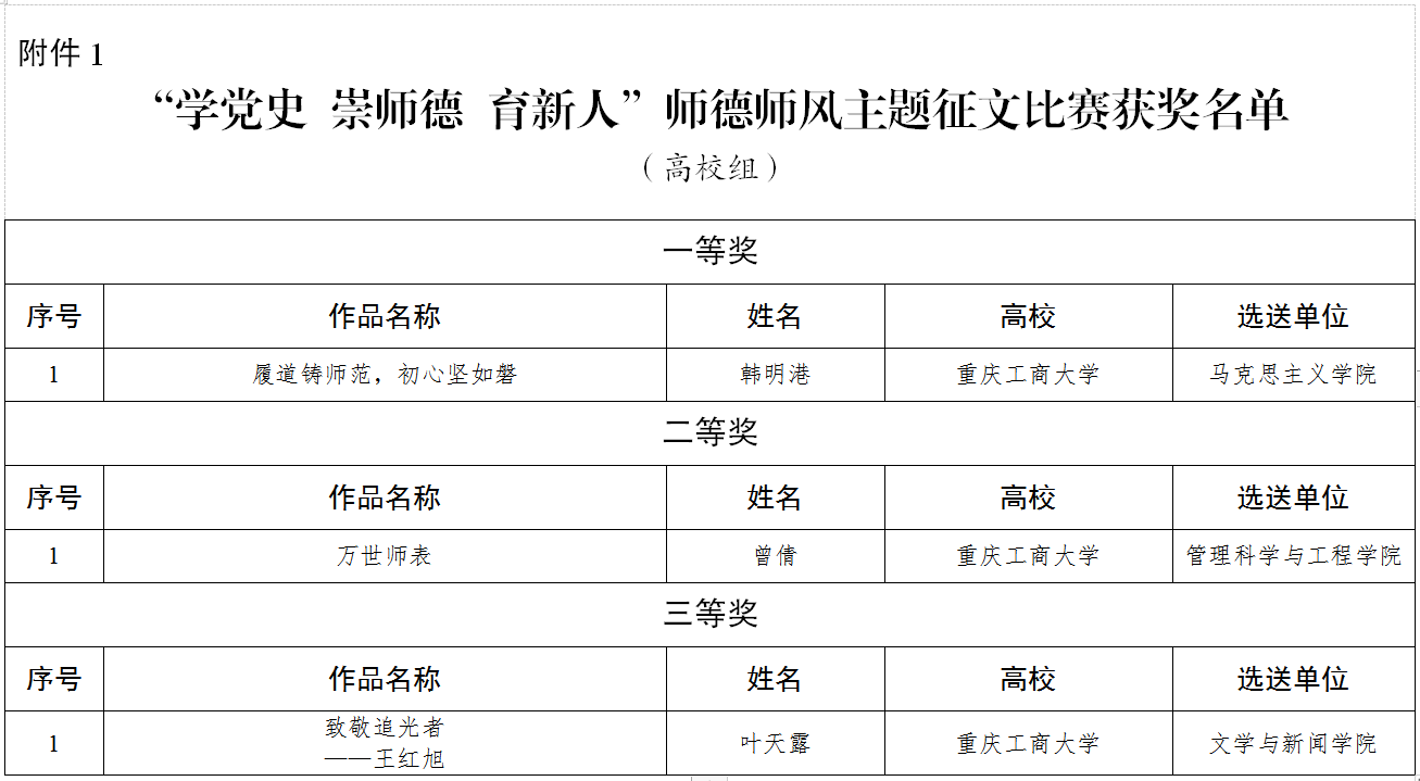 为深入学习贯彻习近平总书记关于教育的重要论述和“七一”重要讲话精神,市教委组织开展了2021年“学党史 崇师德 育新人”师德师风主题征文比赛和优秀师德师风案例评选,完美官网征文作品《履道铸师范,初心坚如磐》获一等奖、《万世师表》获二等奖、《致敬追光者——王红旭》获三等奖,案例《党建引领下的高校社会科学师德师风建设》获评优秀案例。
