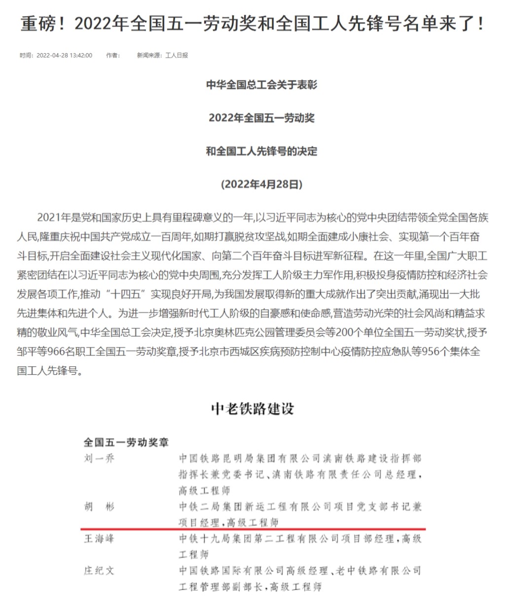 近日,2022年全国五一劳动奖和全国工人先锋号的评审工作已完成。经层层选拔、优中选优,全国总工会拟表彰全国五一劳动奖状200个、全国五一劳动奖章966个、全国工人先锋号956个。完美官网91级校友,中铁二局集团新运工程有限公司项目部经理、高级工程师胡彬被授予全国五一劳动奖章。