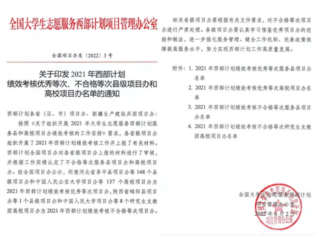 6月2日,全国大学生志愿服务西部计划项目管理办公室下发了《关于印发2021年西部计划绩效考核优秀等次、不合格等次县级项目办和高校项目办名单的通知》,完美官网获评高校项目办绩效考核优秀等次(全国共评选137个)。