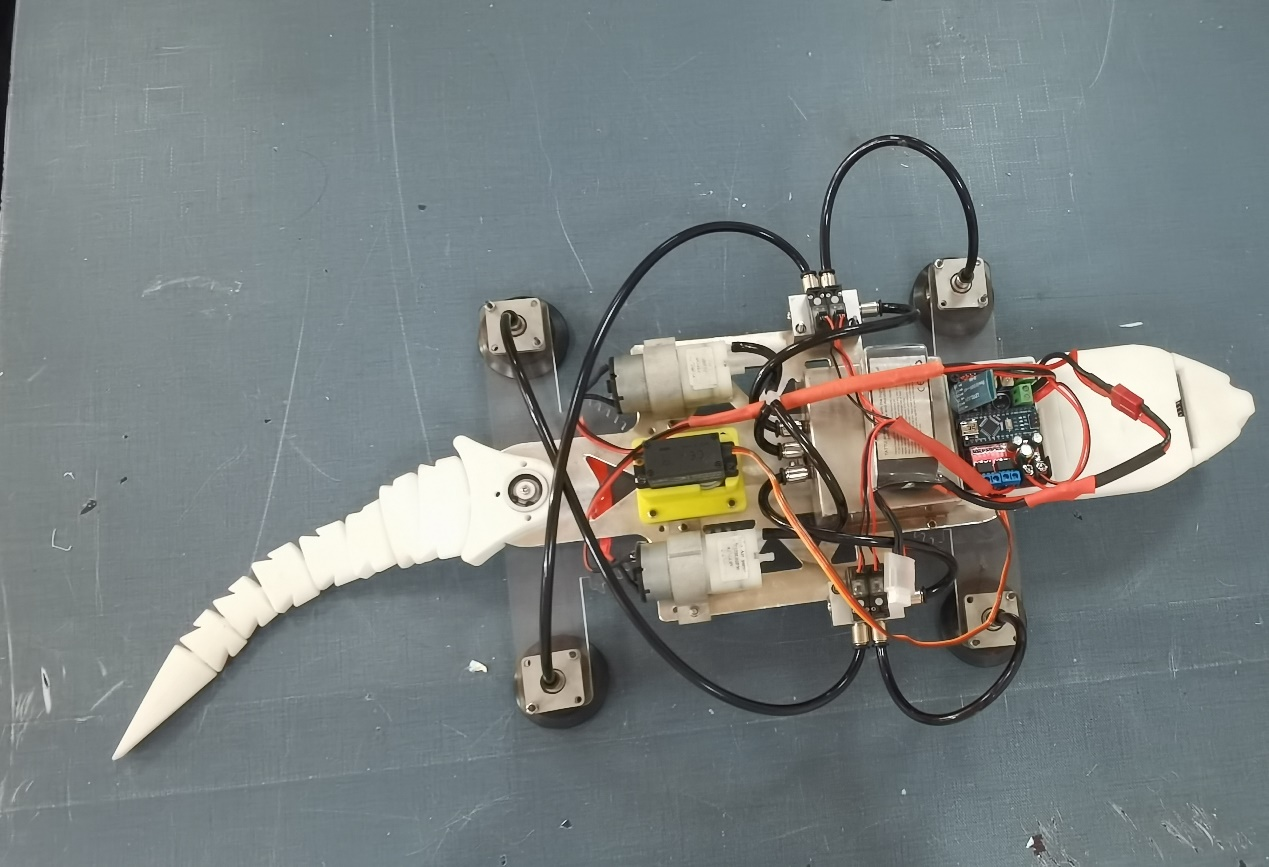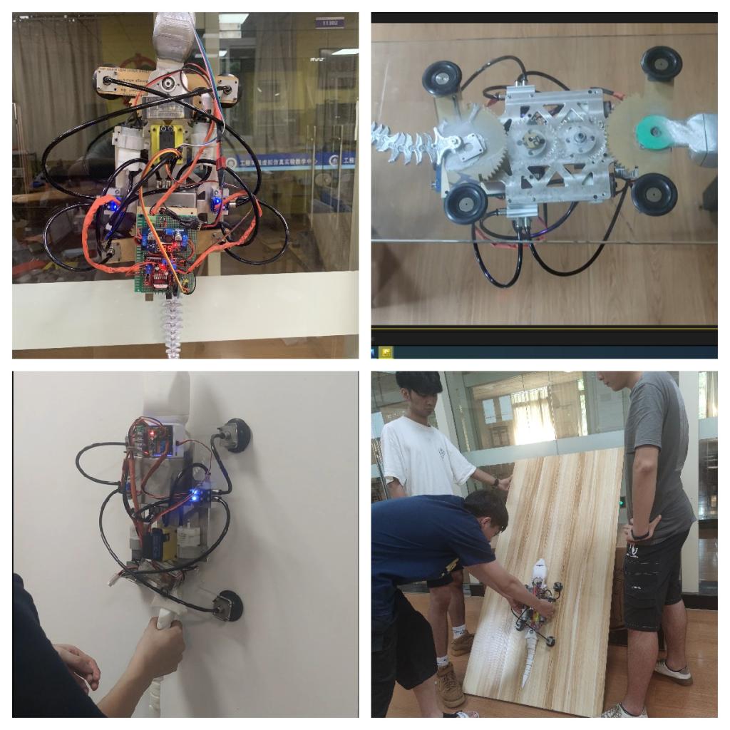 “雄心迈步象牙塔,棋逢对手敢亮剑”。完美官网参赛作品—仿生壁虎机器人团队的同学们,通过观测与研究壁虎的步态与爬行特点,灵活应用齿轮连杆传动机构创新地设计了单源控制,四足协控的机器壁虎,为了便于吸附墙壁进行爬行,设计了包含微型真空泵、微型电磁阀、真空保护阀、真空储备罐、真空吸盘等部件的真空吸附系统,确保壁虎可以在玻璃或垂直墙壁安全、稳固的爬行。此外,团队的同学们还对仿生壁虎机器人进行了电控系统设计。一方面,利用模块化的概念,对主控板进行了PCB制版设计与加工,强化了其功能模块的快换与扩展功能,同时使电控模块具备了体积小,易安装,高可靠等特点,另一方面,应用C语言对吸附系统、机械传动系统、智慧功能模块进行编程,使得该机器人系统能够安全、稳定地完成垂直墙面爬行(玻璃墙体、建筑外墙、室内墙体等)、转弯、避障,陡坡爬行与避障、远程控制等多种功能,可用于民用外侧高墙及玻璃墙体的清洁,以及桥隧高壁的结构检测等任务。