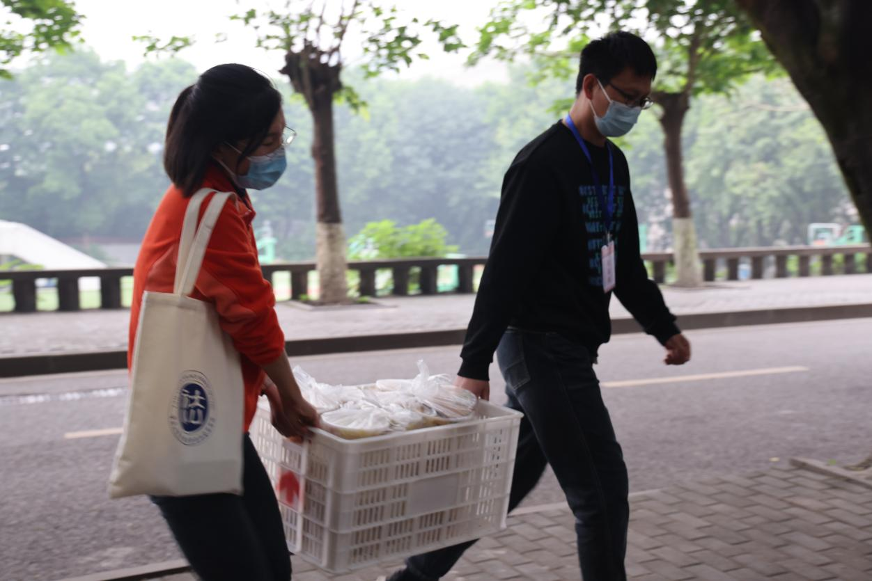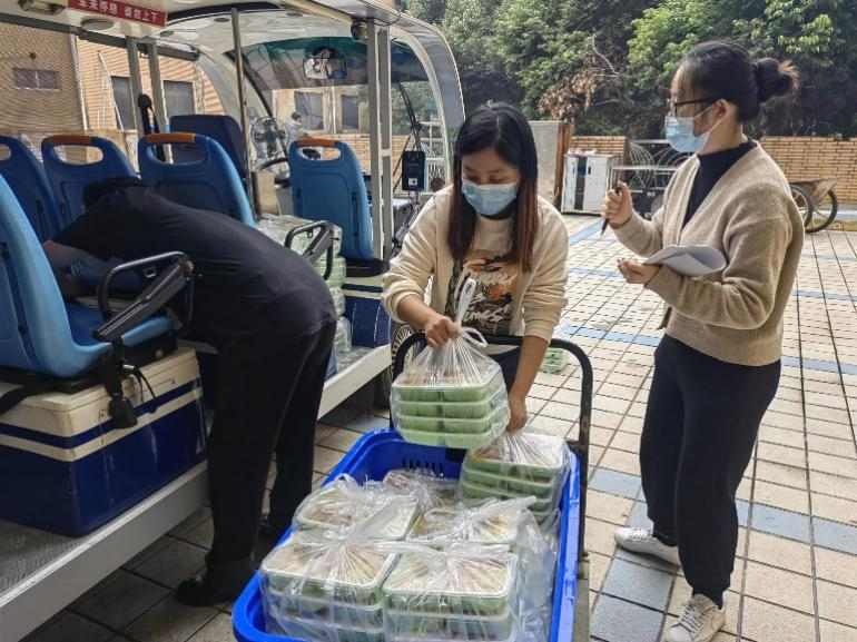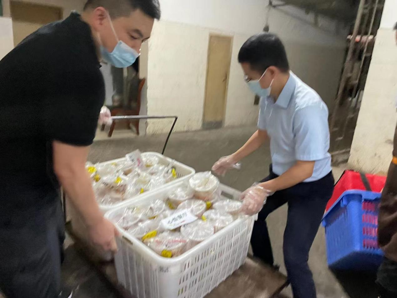 快到晚餐时刻,辅导员们又马不停蹄地赶往食堂,与后勤人员对接,化身为学生的“服务员”,帮助食堂一起打包餐食,然后再送去各个楼栋,“我们的任务就是要让每一个孩子都能够尽量早点吃上饭菜。”“加快脚步,让学生吃上热乎的!”