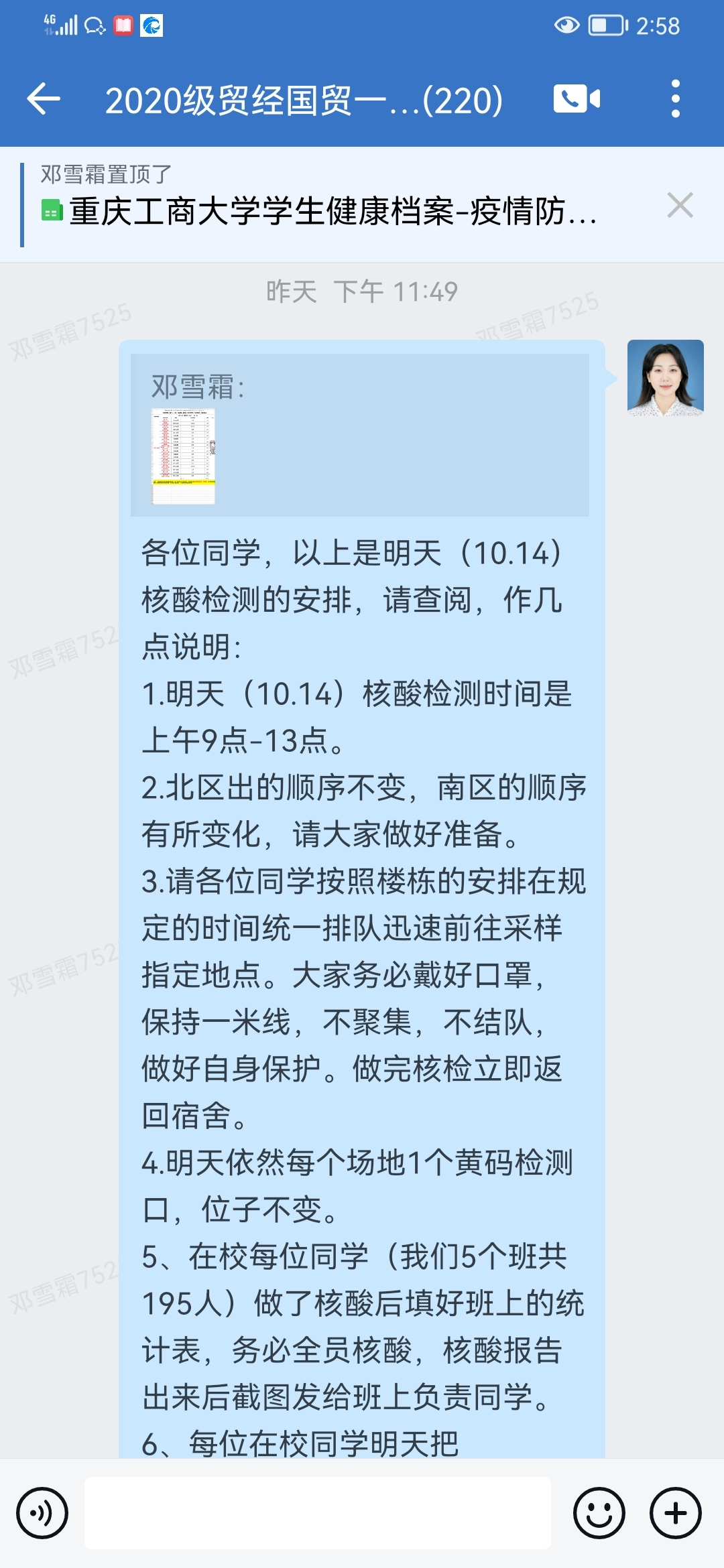 忙碌了一天后,夜幕降临,辅导员们又化身为学生的“勤务员”,打开收集查看同学们需要的物资、药品,抽空给孩子们送去。同时还要担任“心理疏导员”,在群里与同学们聊天,安抚和疏导同学们的情绪,给学生作耐心细致地思想工作。“现在这情况,我们哪里有上下班时间,24小时轮轴转吧。”“叮咚叮咚……”伴随着一声一声的消息提醒,辅导员们的工作还在继续着。