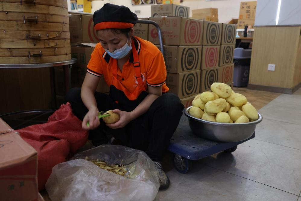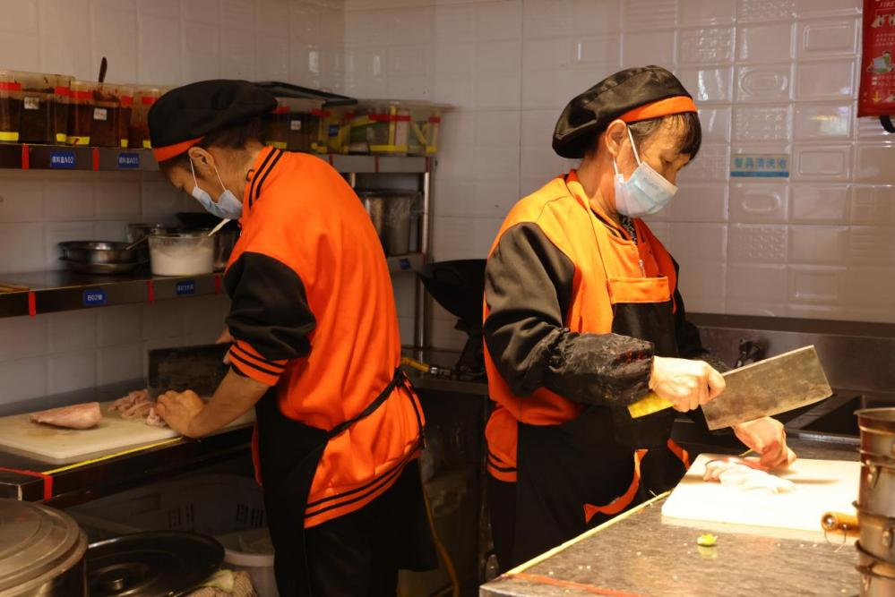 下午,做完核酸的食堂工作人员们返回各自的工作岗位,食堂师傅们又开始投入晚餐的准备工作,准备好食材,给锅炉升温,削皮、切菜、洗菜、蒸煮;新一轮的消毒工作,卫生打扫、场地消杀……,把上午的工序集体再上演一次。“菜品要尽量和中午不一样,不然娃儿些要吃腻”。