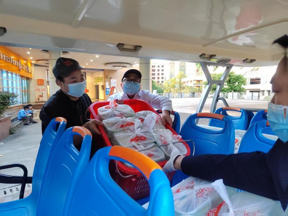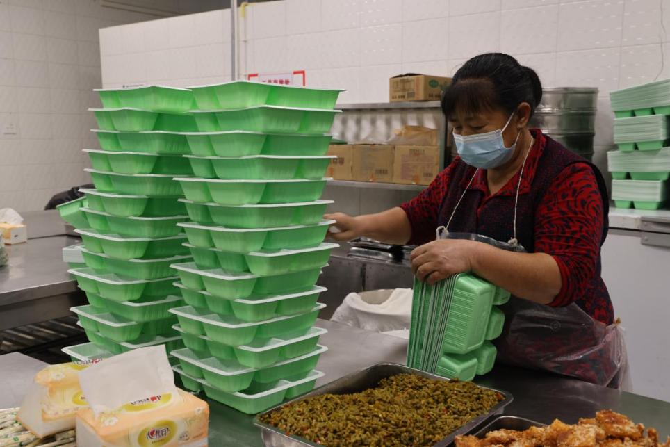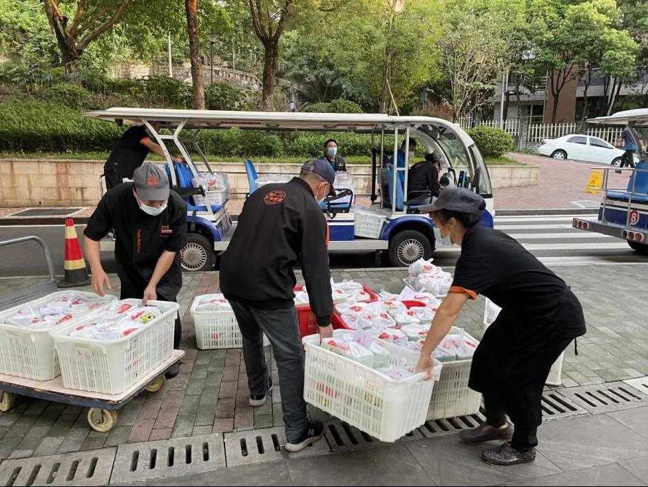 临近中午,香气扑鼻的午餐制作好了,厨师们将菜品转交给分餐员。分餐人员开始开餐盒、装菜肴、备餐具、封餐盒、打包……午餐配送前,消毒员再一次对餐车进行全面消毒处理,做好最后的准备。送餐员则根据配送信息,仔细清点餐品数量,迅速装箱装车。回到食堂,收拾后厨,做好清洁卫生后,时间已经接近14:00。“赶快抓紧时间吃饭哈,吃完饭去做核酸,完了赶紧回来哟!”