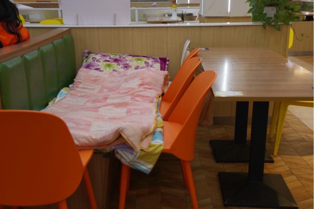 深夜,忙碌了一天的食堂员工们放下手中的工作,有的员工睡在桌椅上,有的更是直接在地板上打地铺……带着满身疲惫进入梦乡。短短几小时过后,他们又将继续新一天的辛勤工作。