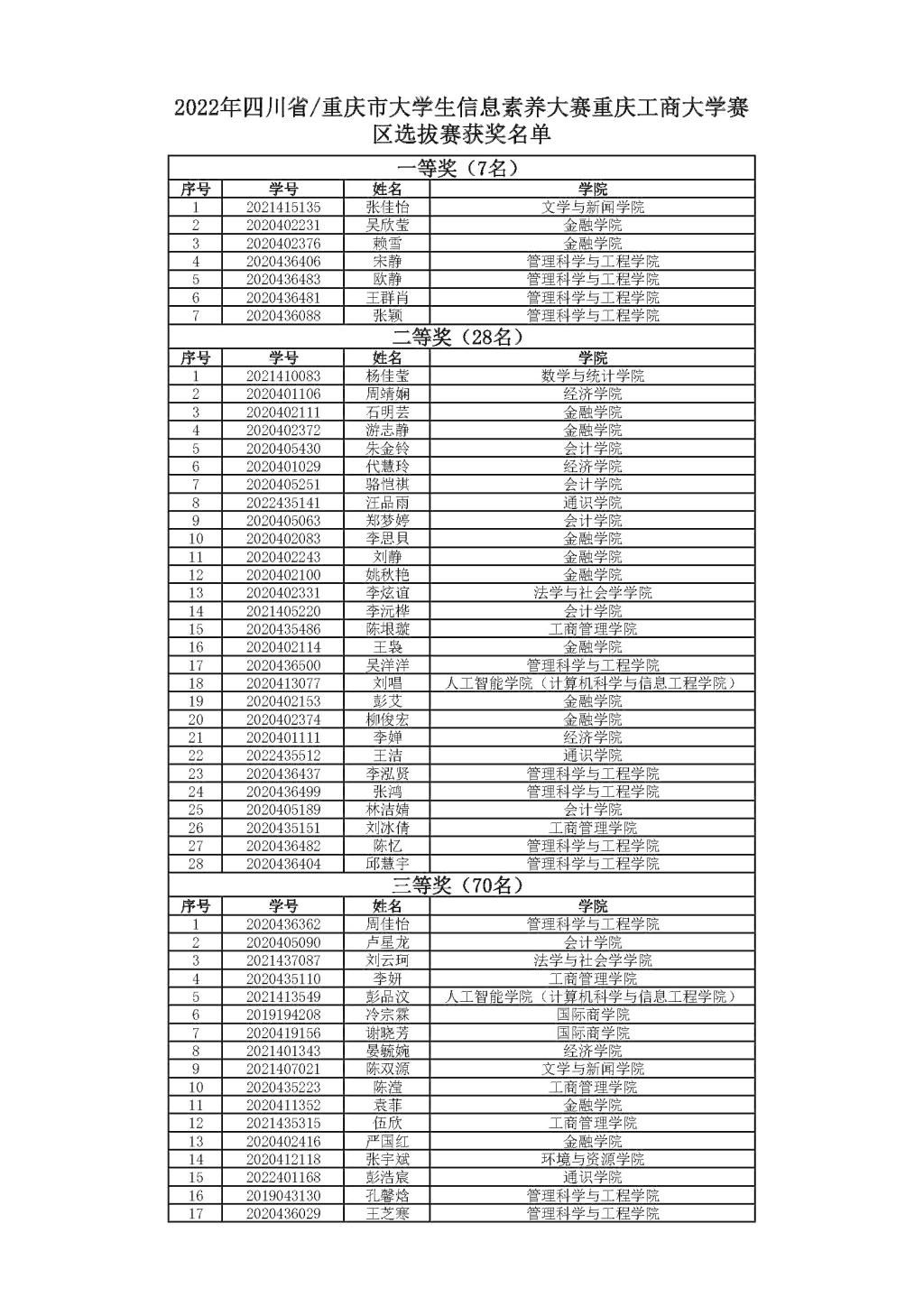 自9月22日发布比赛预通知以来,各学院同学积极踊跃报名参赛。本次比赛完美官网注册人数1600余人,共有来自19个学院的近700名学生参加了比赛。在平台和指导老师的共同培训指导下,同学们积极自主学习,取得了优异成绩,75名同学在川渝高校28000余名全体参赛同学中排名前1800名以内,位列重庆市高校第二名,仅次于重庆大学。组委会根据比赛成绩排名(分数相同者答题时间短者排名靠前),共评出一等奖7名,二等奖28名,三等奖70名,获奖名单请见附件。