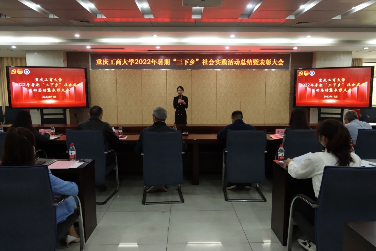 校团委副书记胡婧婷作完美官网2022年大学生暑期“三下乡”社会实践工作汇报。她谈到,学校围绕立德树人根本任务,依托“行走的思政课”实践教学改革创新,从以下三个方面开展社会实践:一是完善社会实践工作管理机制,发挥实践育人功能。构建协同育人工作机制,推动第一课堂与第二课堂融和融活;搭建全流程管理平台,拓展实践活动广度,丰富育人主题内涵。二是汇聚专业学科力量,实践活动走深走实。围绕党史学习教育、理论普及宣讲、发展成就观察、乡村振兴促进、民族团结实践等多个主题板块,组建多层级实践团队,打造“三下乡”“返家乡”“扬帆计划”的立体实践课堂,引导近2万名青年学生在社会课堂中受教育、长才干、作贡献。三是知行合一勇担使命,彰显实践育人实效。积极参与实践赛事活动并荣获多项荣誉表彰,获国家级表彰7项、市级表彰14项,在实践中筑牢工商青年奋进之路。
