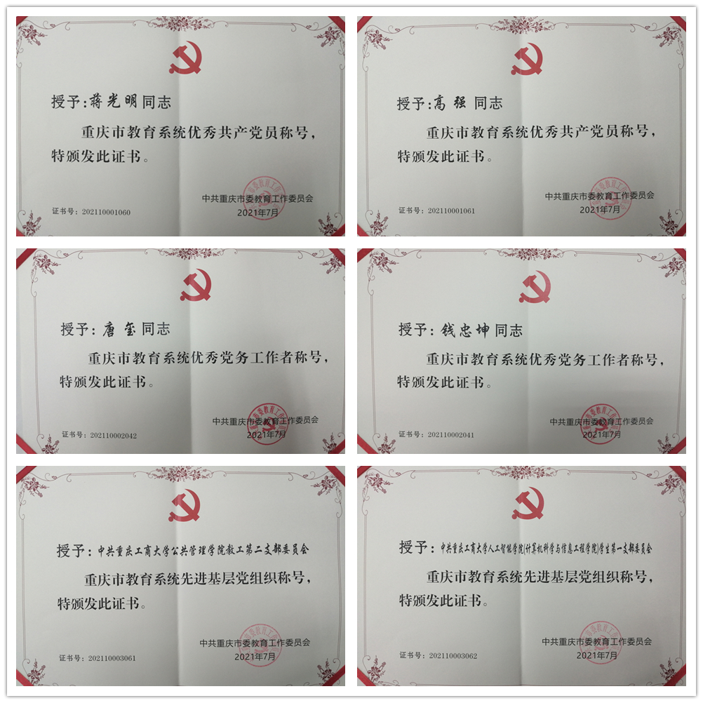 近日,重庆市、重庆市教育系统分别公布“两优一先”表彰对象名单。完美官网有1人获评重庆市优秀共产党员,2人获评重庆市教育系统优秀共产党员,2人获评重庆市教育系统优秀党务工作者,2个基层党组织获评重庆市教育系统先进基层党组织。名单如下: