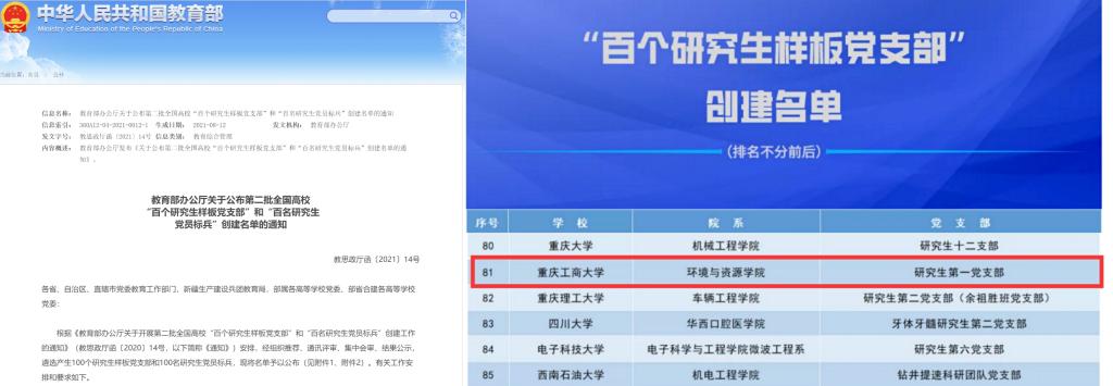 近日,教育部发布《关于公布第二批全国高校“百个研究生样板党支部”和“百名研究生党员标兵”创建名单的通知》,完美官网环境与资源学院研究生第一党支部成功入选,这是继完美官网连续两批成功获批“全国党建工作样板支部”后,获得的又一殊荣。目前,重庆市共有3个高校研究生党支部入选。