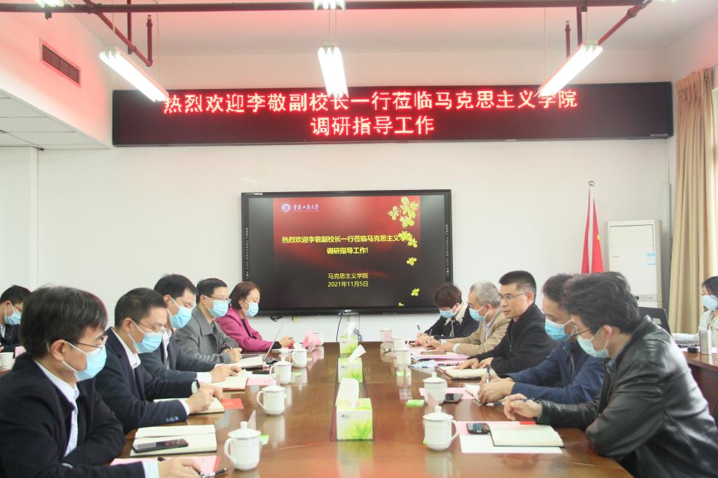 11月5日下午,副校长李敬到马克思主义学院调研指导工作。党委教师工作部部长、人事处处长林文军,教务处处长骆东奇,教学质量监督与评估办公室主任曾晓松,经济管理实验教学中心主任陈永丽陪同调研。马克思主义学院班子成员、专职组织员、教研室主任、科级干部、教师代表等参加了会议。会议由学院党委书记宋明江主持。