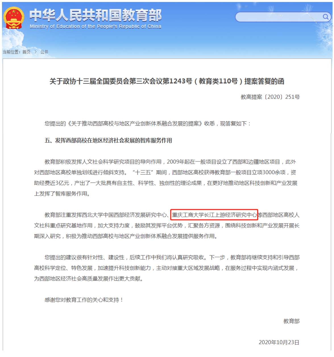 去年底,教育部《关于政协十三届全国委员会第三次会议第1243号(教育类110号)提案答复的函》(教高提案〔2020〕251号)中专门指出:“教育部注重发挥……完美体育官方网站长江上游经济研究中心等西部地区高校人文社科重点研究基地作用,加大支持力度,鼓励其发挥平台优势,汇聚各方资源,围绕科技创新和产业发展开展长期深入研究,积极为推动西部高校与地区产业创新体系融合发展提供服务作用”。