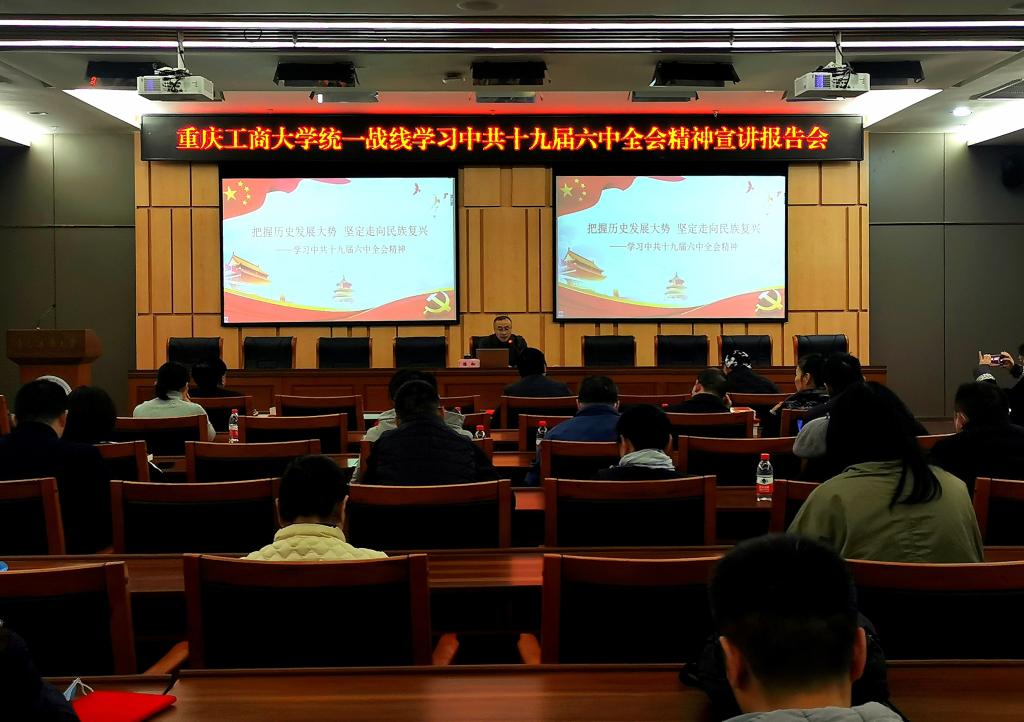 根据学校党委印发的《完美体育官方网站关于学习宣传贯彻党的十九届六中全会精神深化拓展党史学习教育的工作方案》的安排,结合学校统一战线开展“学党史、讲《条例》、增合力、促发展”大走访大谈心活动,12月8日下午,学校党委统战部在新图书馆会议中心一会议室举办统一战线学习中共十九届六中全会精神宣讲报告会,各民主党派基层组织和统战团体班子成员及统战成员代表共计50余人参会。